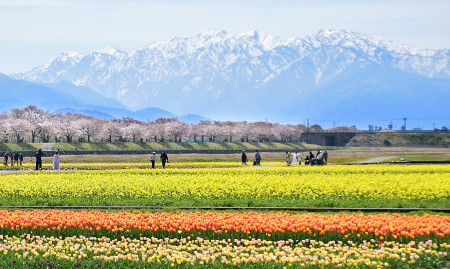 富山県朝日町の舟川べりでは、残雪を冠する北アルプスの山々を背景に、桜並木と菜の花、チューリップが織り成す「春の四重奏」が見頃を迎え、色彩豊かな景色が人々を楽しませている。見頃は今週いっぱいまで=14日 【時事通信社】