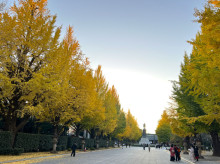靖国神社(千代田区九段北3)境内のイチョウが鮮やかな黄金色に染まり、見頃を迎えている。