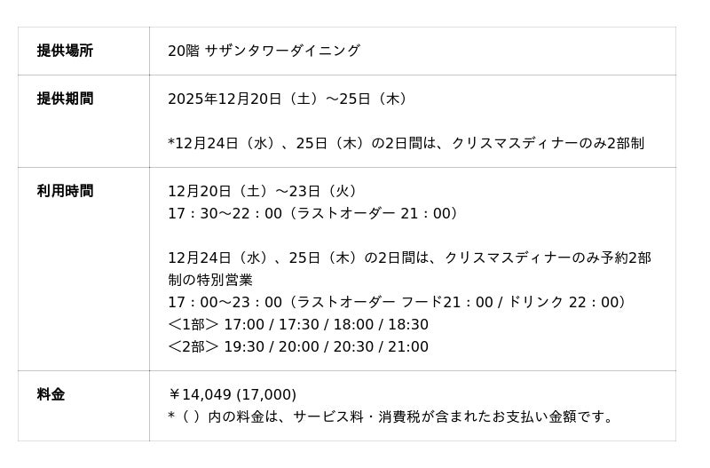 「小田急ホテルセンチュリーサザンタワー」(所在地:東京都渋谷区代々木2-2-1、総支配人:宮越 真理子)内、「サザンタワーダイニング」(20階)では、2025年12月20日(土)から12月25日(木)までのディナータイムに「クリスマスディナー」を提供します。