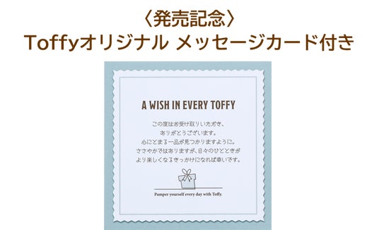 発売を記念して、Toffy オリジナルメッセージカードを初回限定でお付けいたします。感謝の気持ちと、日々がちょっと楽しくなるような想いを込めたメッセージカードです。※数量限定、なくなり次第終了となります。