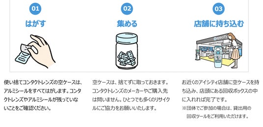 「アイシティ ecoプロジェクト」は、リサイクルが可能な使い捨てコンタクトレンズの空ケースを対象に、全国のアイシティ店舗に加え、活動にご賛同いただいた自治体・企業・学校など全国約8,800箇所に専用ボックスを設置して回収するリサイクル活動です。3つの社会貢献(1.空ケースの再資源化による環境保全、2.障がい者の自立・就労支援、3.日本アイバンク協会への寄付)へとつないでいくことを目的として、2010年より業界で初めてこの活動をスタートし、今年で活動期間は16年目を迎えました。